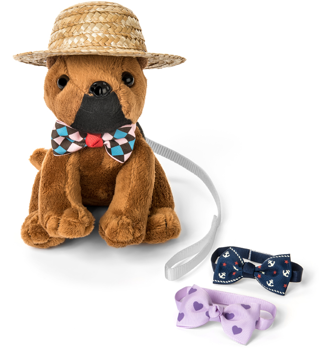 Each set includes the plush dog, 3 bow-ties, a dapper straw hat, collar and leash. The collar is designed with velcro so that small fingers will not get pinched when adding or removing it.
